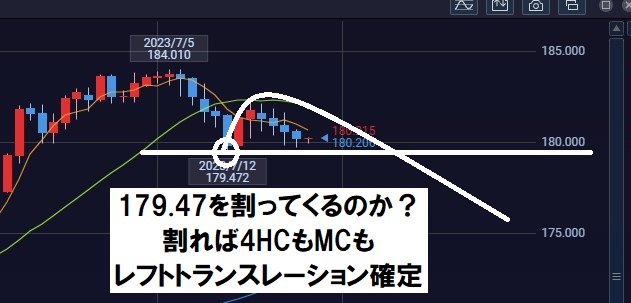 ポンド円は4日連続で安値切り下げが続いていますので、このまま続落して179.47の起点を割ってMCと4HCでレフトトランスレーションが確定する可能性も考えられます。