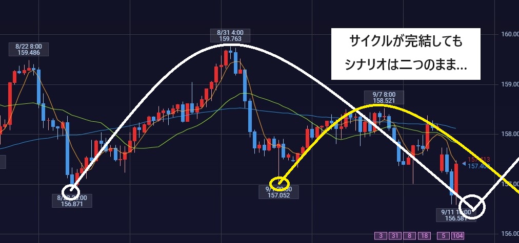 ただし、黄色のシナリオはレフトトランスレーションで確定しいるので、上昇して4HC天井158.52を超えるようであればこのシナリオは消滅します。