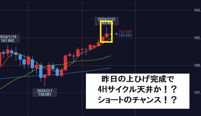 またユーロ円含む複数のクロス円通貨で高値更新して上ひげ完成していますので、4HC天井の可能性が高まっています。