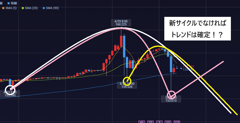 そうなるとPC(プライマリーサイクル)も160.22が天井になって、ボトムに向けた下落が始まります。