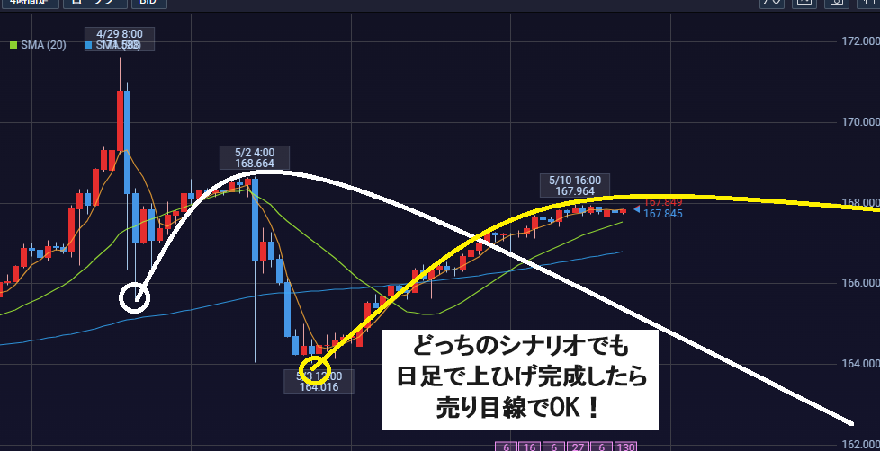 そうなったら、4HC白のシナリオは戻り売りのチャンス、黄色のシナリオは4HC天井の可能性が高くなってショートエントリーのチャンスになります。