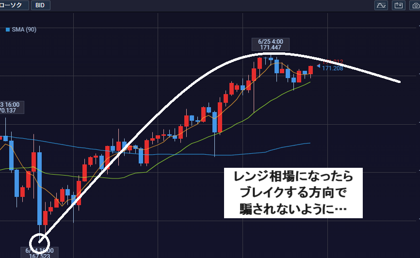 なので今回は高値付近でレンジ相場を形成した場合、上方向にブレイクしたとしても焦らず反転のサインを待つことが重要です。