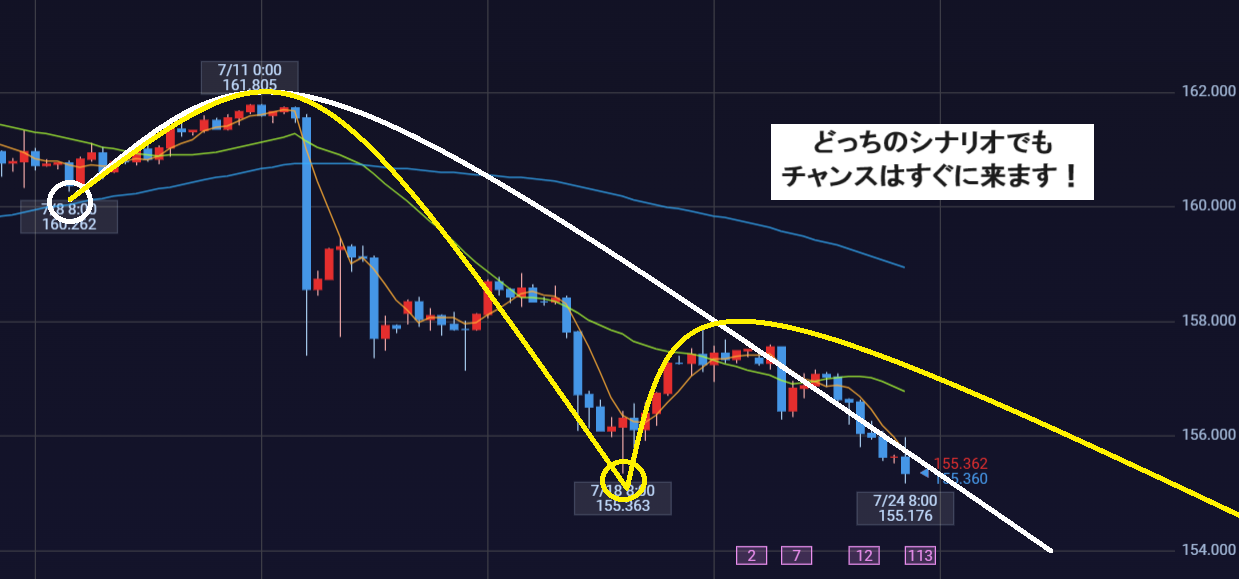 続落する場合、黄色のシナリオの可能性が高まりますが、その際は戻り目ができれば戻り売りのチャンスになります。