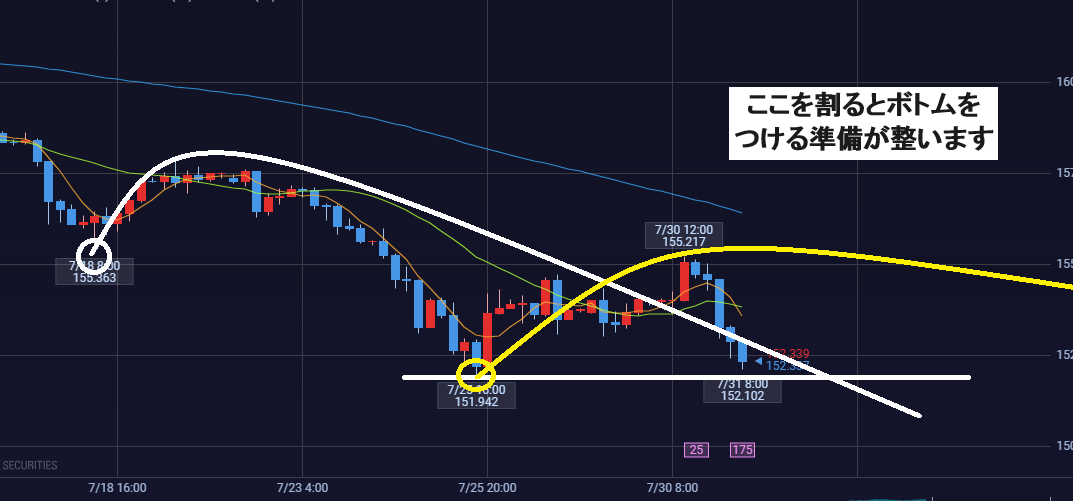 ボトムの水準は151.94なので、ここを割ってきたらいつボトムをつけてもおかしくない状況に進んでいきます。