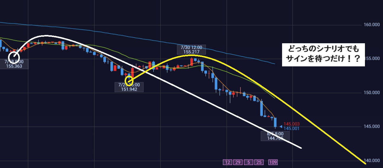反転上昇して日足で下ひげ完成した場合、4HC白のシナリオでボトムの可能性が高まります。