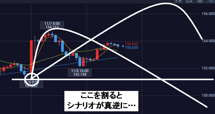 昨日の高値を超えてきた場合、引き続き154.71超えの高値更新があるのかに注目することになります。