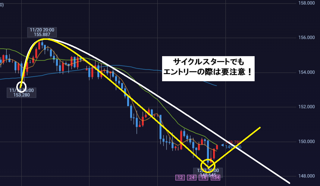 もし今日上昇して、昨日の高値を超えてくるようであれば148.64が起点の新サイクルスタートの可能性が出てきます。