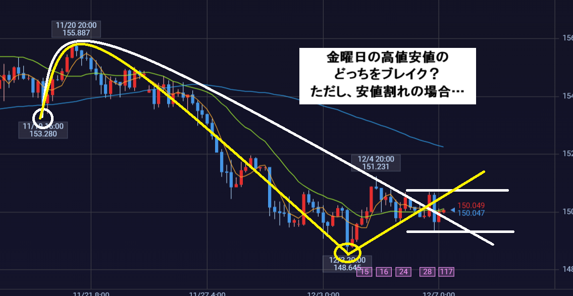 金曜日の日足は上下にひげがあるので、今日は上ひげ下ひげのどちらをブレイクしてくるのかに注目です。