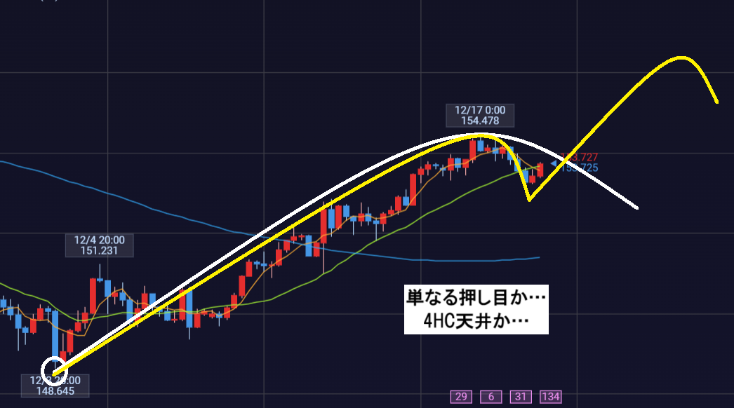 今日しっかり下落すれば、154.47が4HC天井の可能性が高くなりますが・・・