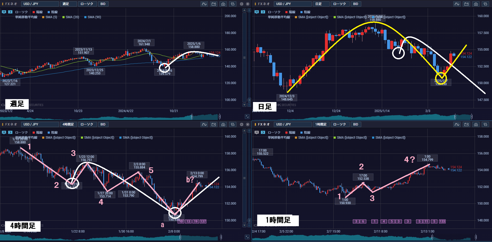 画像はドル円の週足、日足、4H足、1H足
