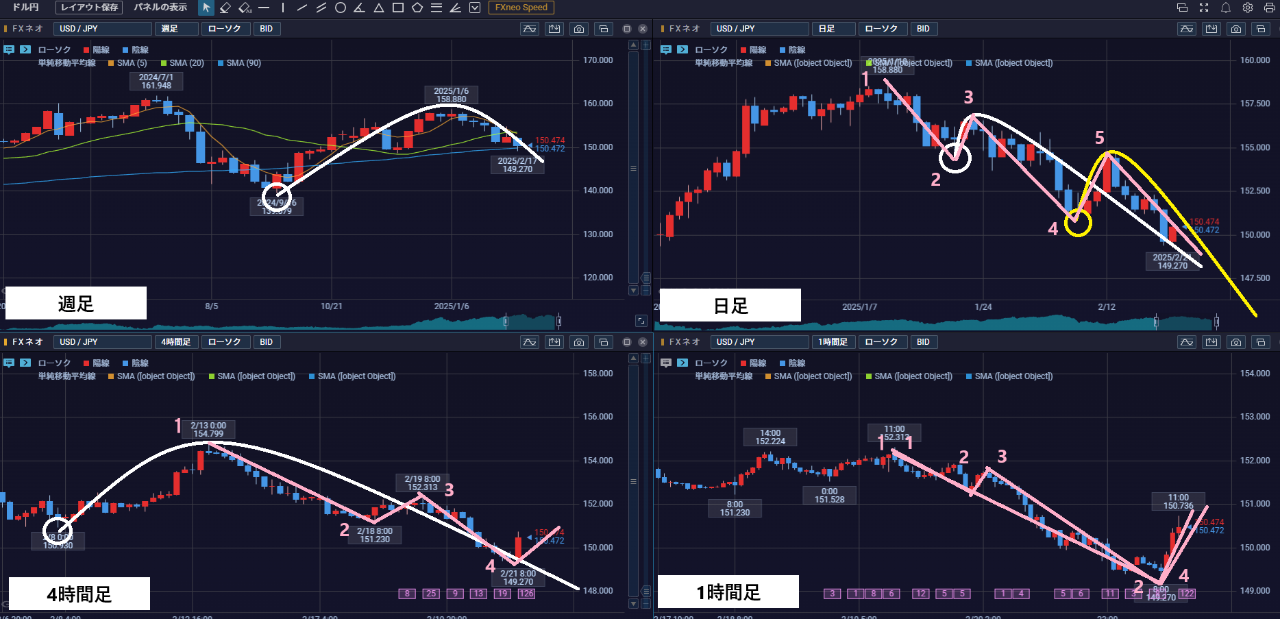 4時間足はいま、ダウン4波目を形成中なので、一つ小さい1時間足は3波構成になります。