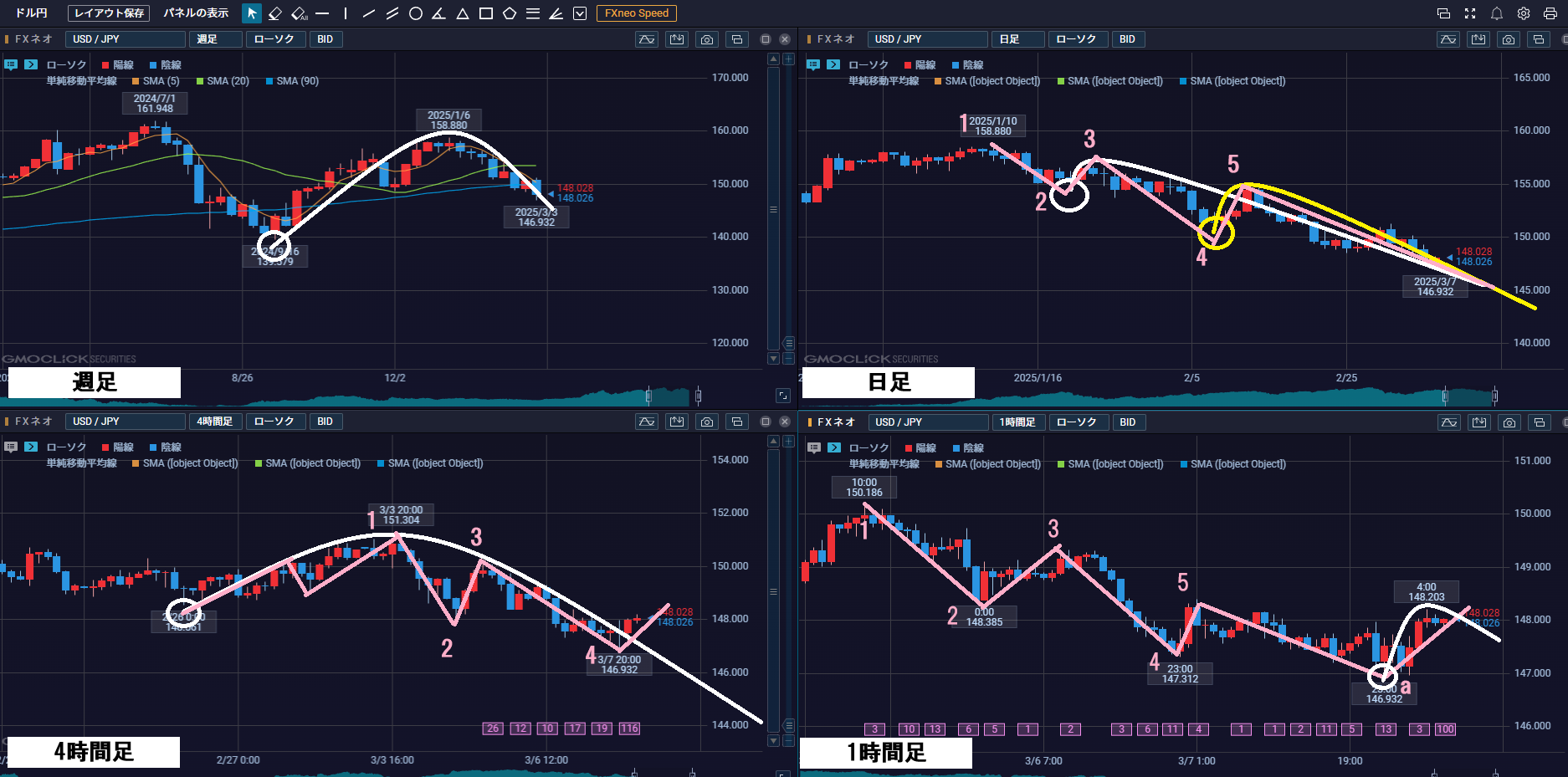 画像はドル円、週足、日足、4H、1Hチャート