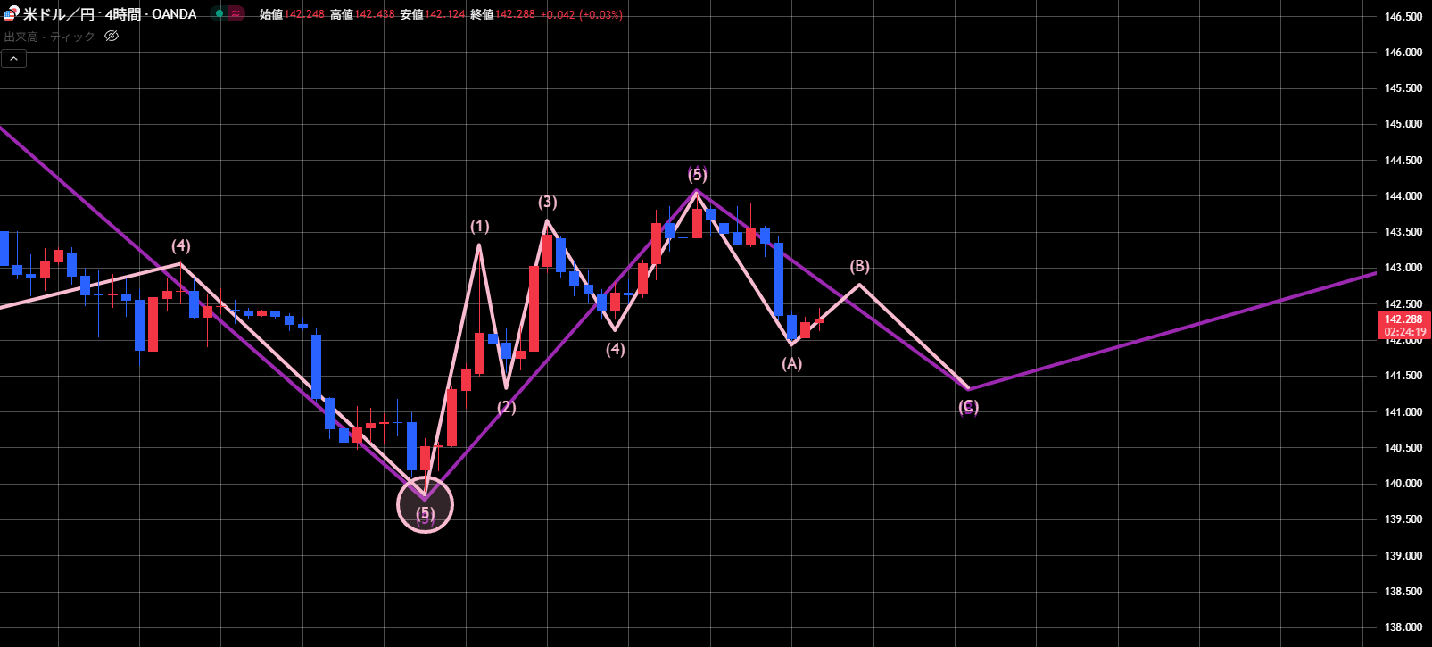 4時間足のエリオット波動は修正波に入っていますが、5-3-5ジグザグから3-3-5のフラットにカウントし直しました。