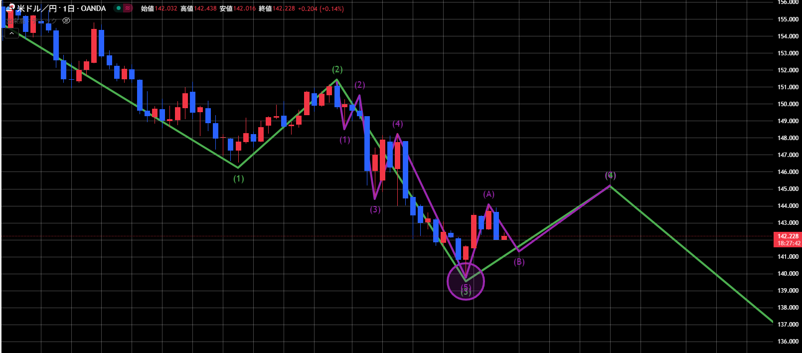 各画像の〇印はサイクル理論の起点、折れ線はエリオット波動になります。エリオット波動は一つ大きい時間軸も表示されています。