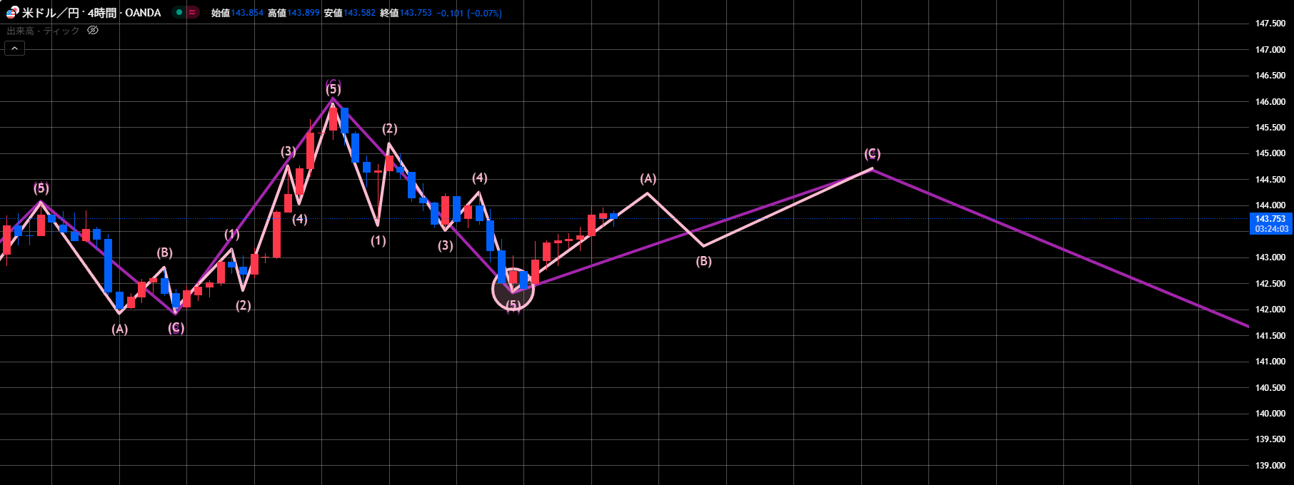 直近高値3本目144.00が天井の可能性が高くなっています。