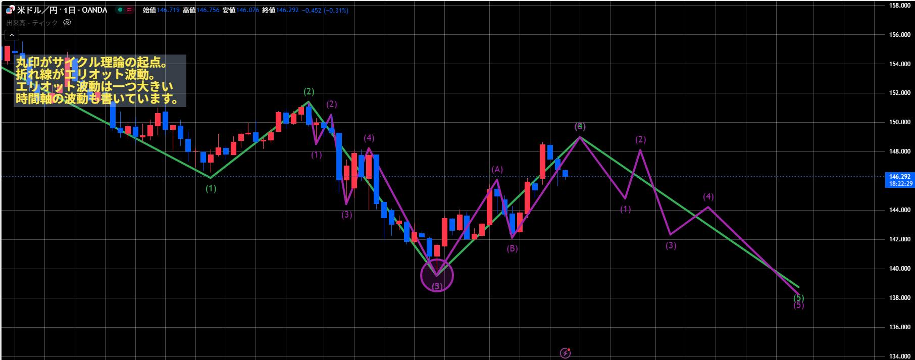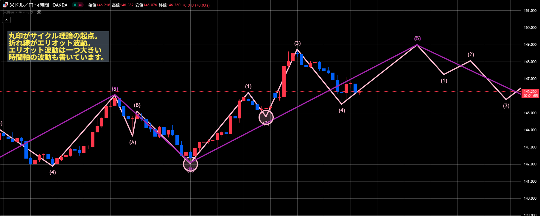 148.65がサイクル理論のMCと4HCの天井、日足と4時間足のエリオット波動5波の終点、週足のエリオット波動は4波終点になります。