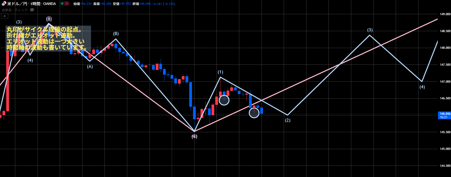 各画像の〇印はサイクル理論の起点、折れ線はエリオット波動になります。エリオット波動は一つ大きい時間軸も表示されています。