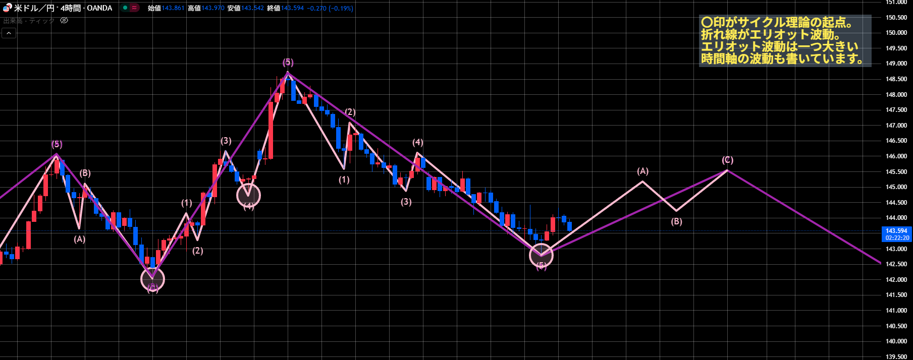 考えすぎるとどっちつかずになってしまいますが、ポイントを絞ると新サイクルスタートならしっかり上昇できるのか、サイクル継続ならまずは142.80を割れるのか、になります。