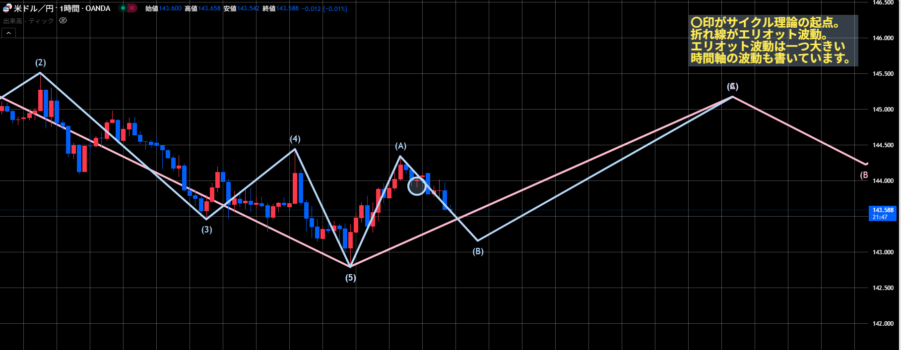 各画像の〇印はサイクル理論の起点、折れ線はエリオット波動になります。エリオット波動は一つ大きい時間軸も表示されています。