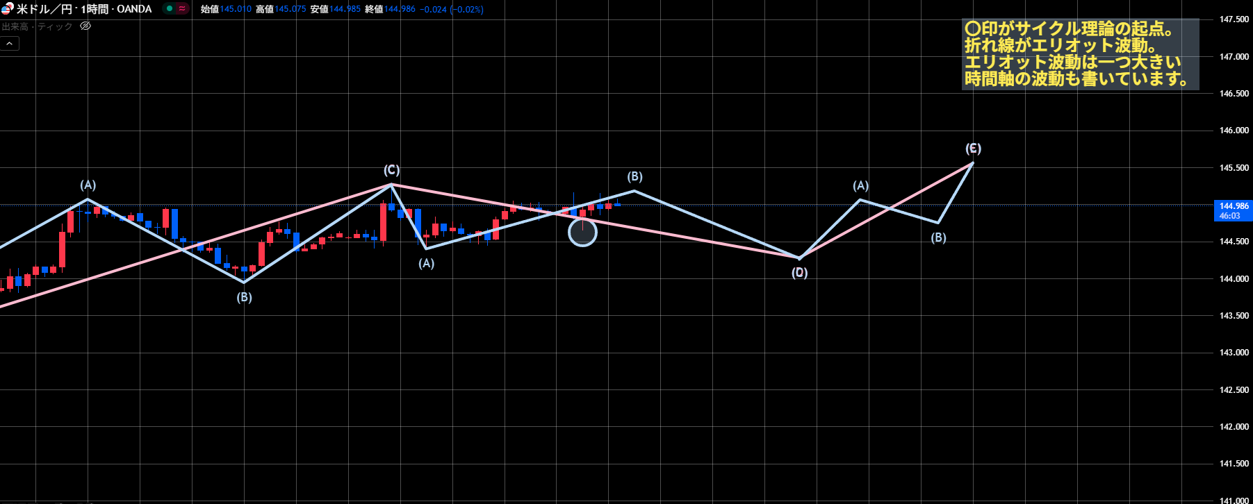 各画像の〇印はサイクル理論の起点、折れ線はエリオット波動になります。エリオット波動は一つ大きい時間軸も表示されています。