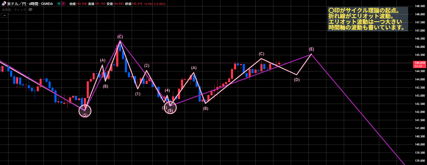 昨日のブログ配信直後に145.09を超えてきましたので、シナリオとカウント変更をしています。