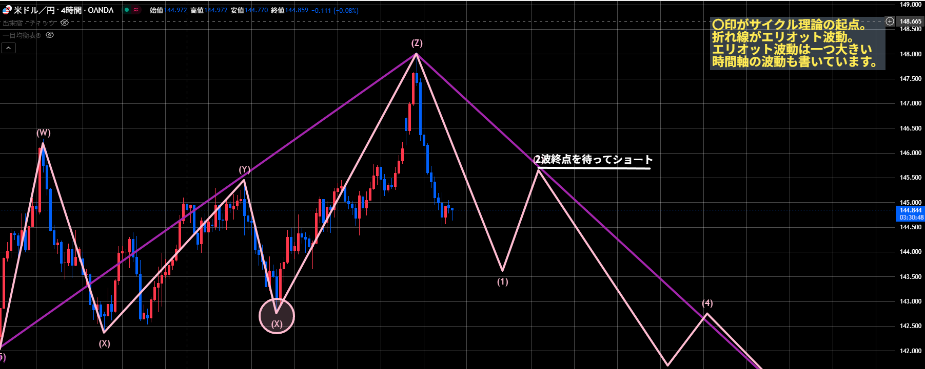 各画像の〇印はサイクル理論の起点、折れ線はエリオット波動になります。エリオット波動は一つ大きい時間軸も表示されています。