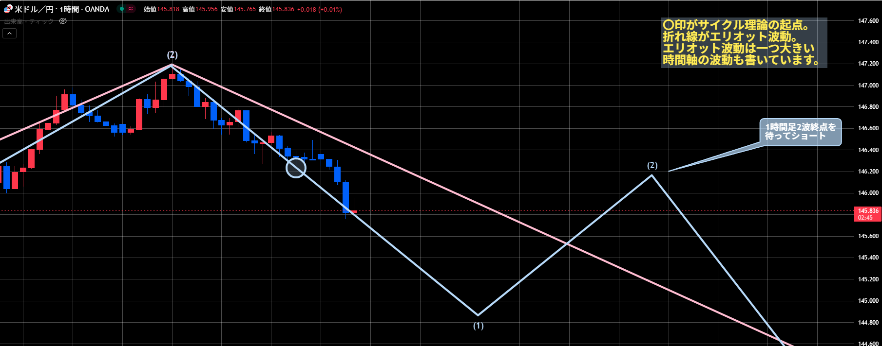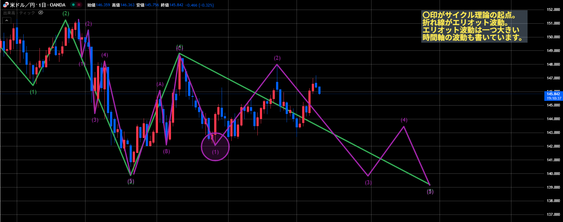 各画像の〇印はサイクル理論の起点、折れ線はエリオット波動になります。エリオット波動は一つ大きい時間軸も表示されています。