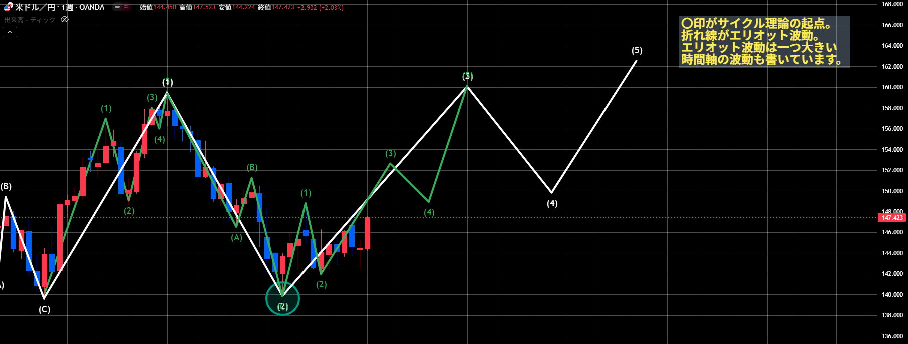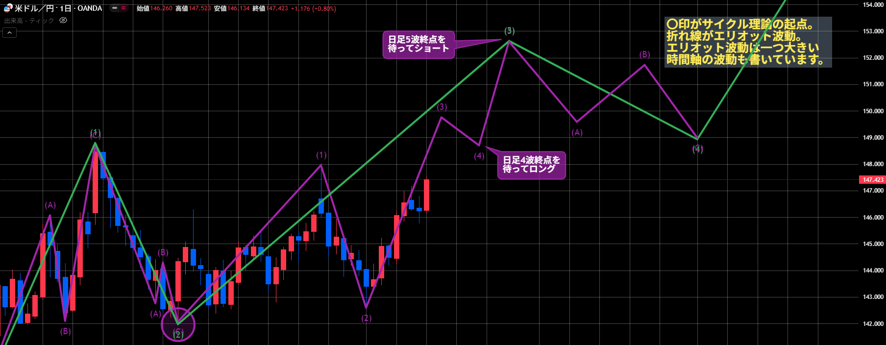 各画像の〇印はサイクル理論の起点、折れ線はエリオット波動になります。エリオット波動は一つ大きい時間軸も表示されています。