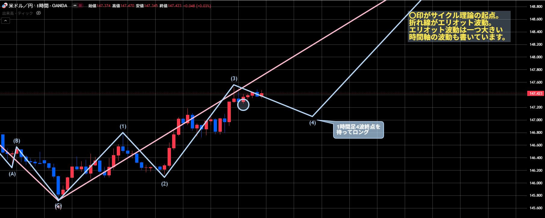 ロングであるとすれば、1時間足のエリオット波動4波終点を待ってからロングエントリーになります。