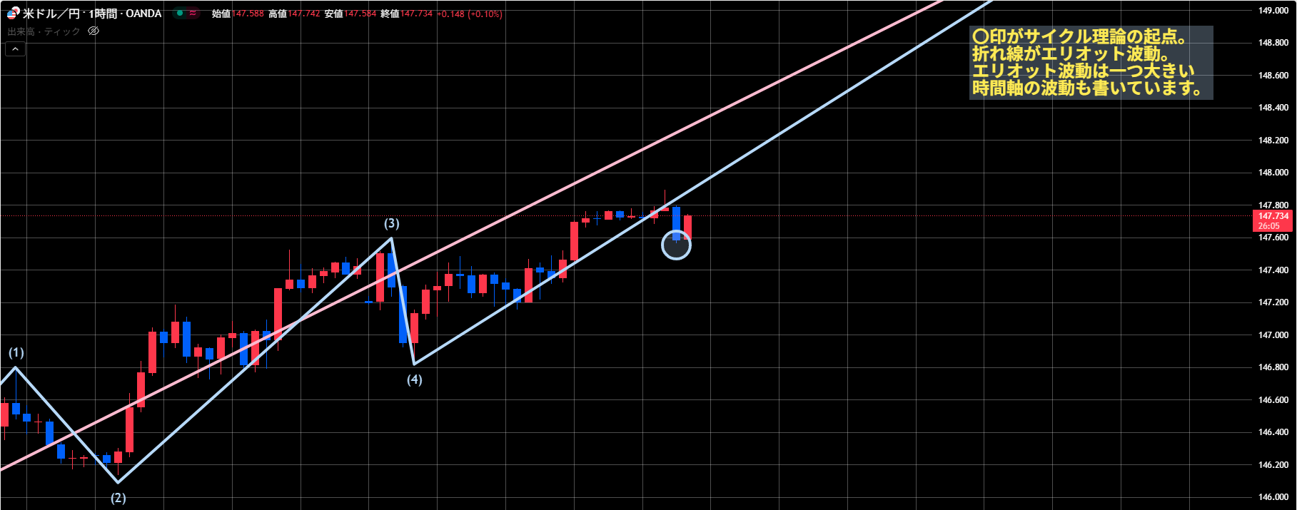 メジャーサイクルがまだ天井をつけていない想定なので、メジャーサイクルの直近高値、日足のエリオット波動1波終点の148.03が4Hサイクル天井の目安で見ています。