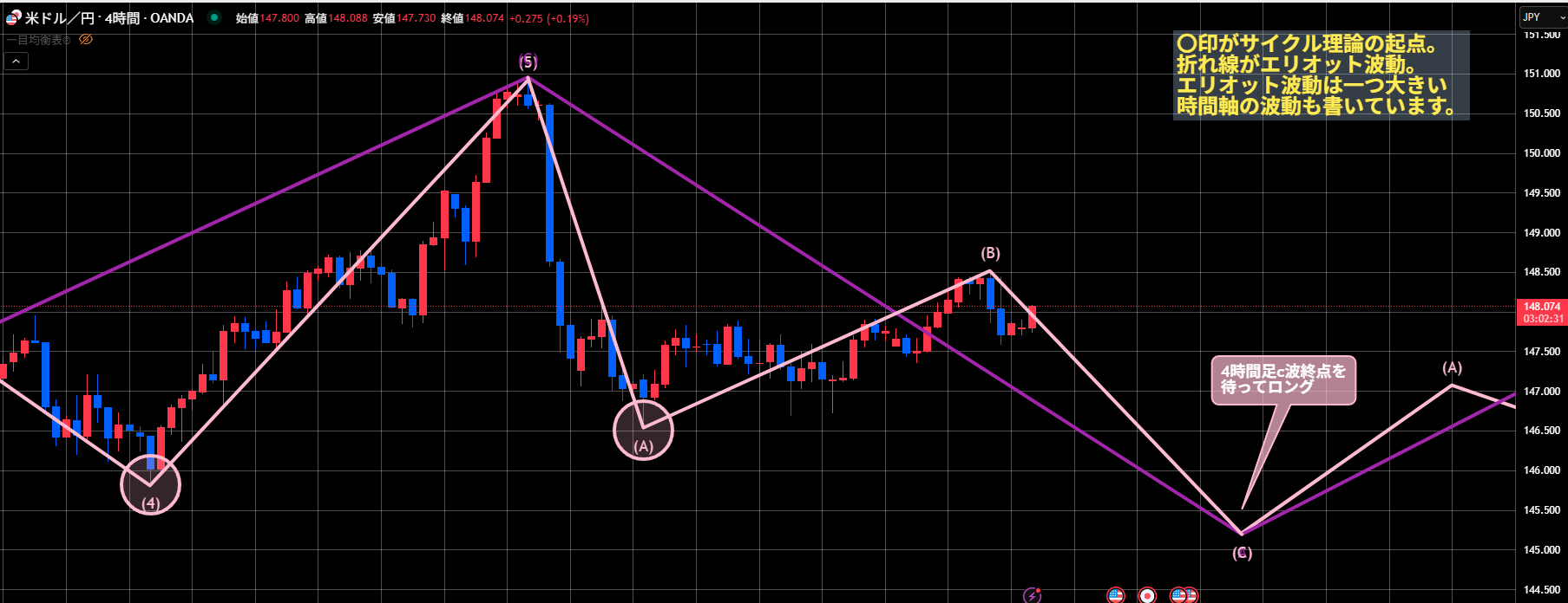 サイクル理論だけ使うと、下記の画像のイメージです。(ユーロ円4Hチャート)