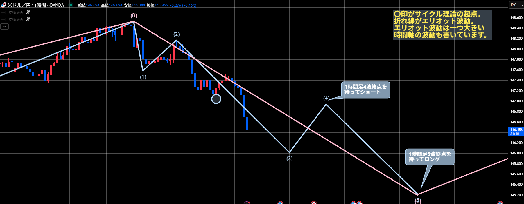 146.62を割ったので4時間足のサイクル理論44本目のシナリオがレフトトランスレーションで確定しました。
