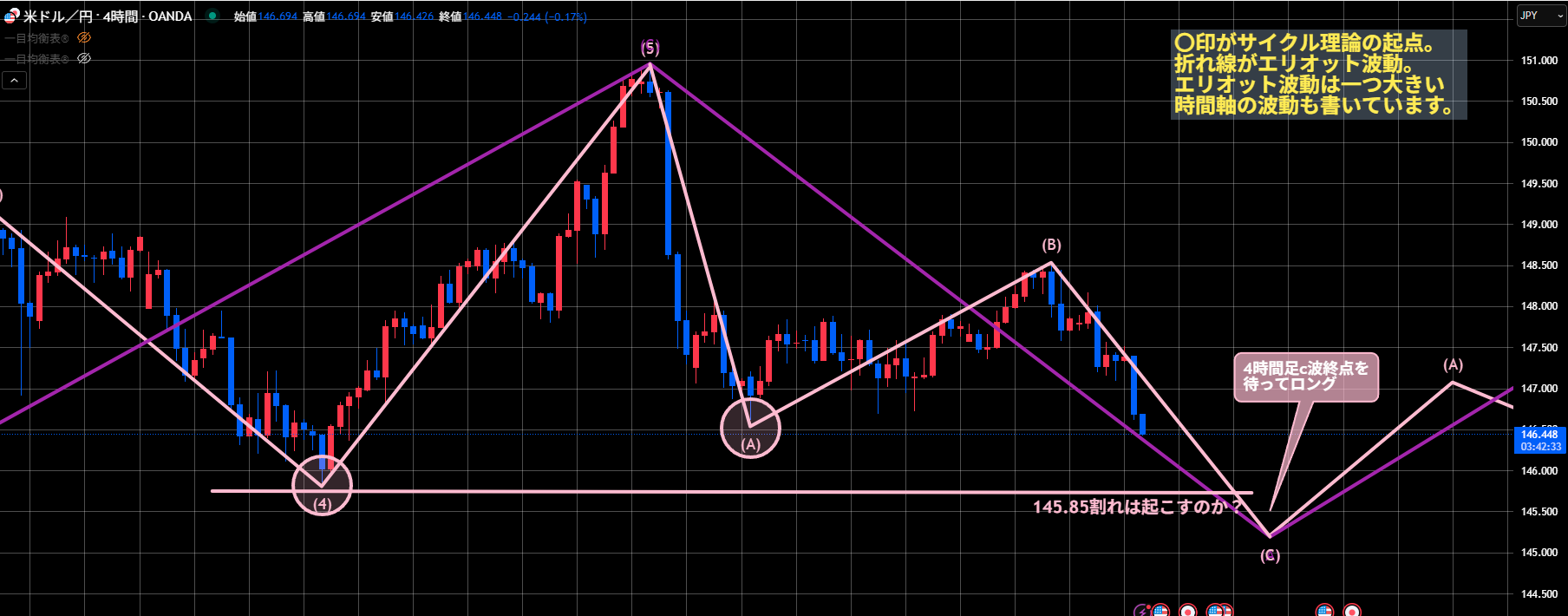 146.62を割ったので4時間足のサイクル理論44本目のシナリオがレフトトランスレーションで確定しました。
