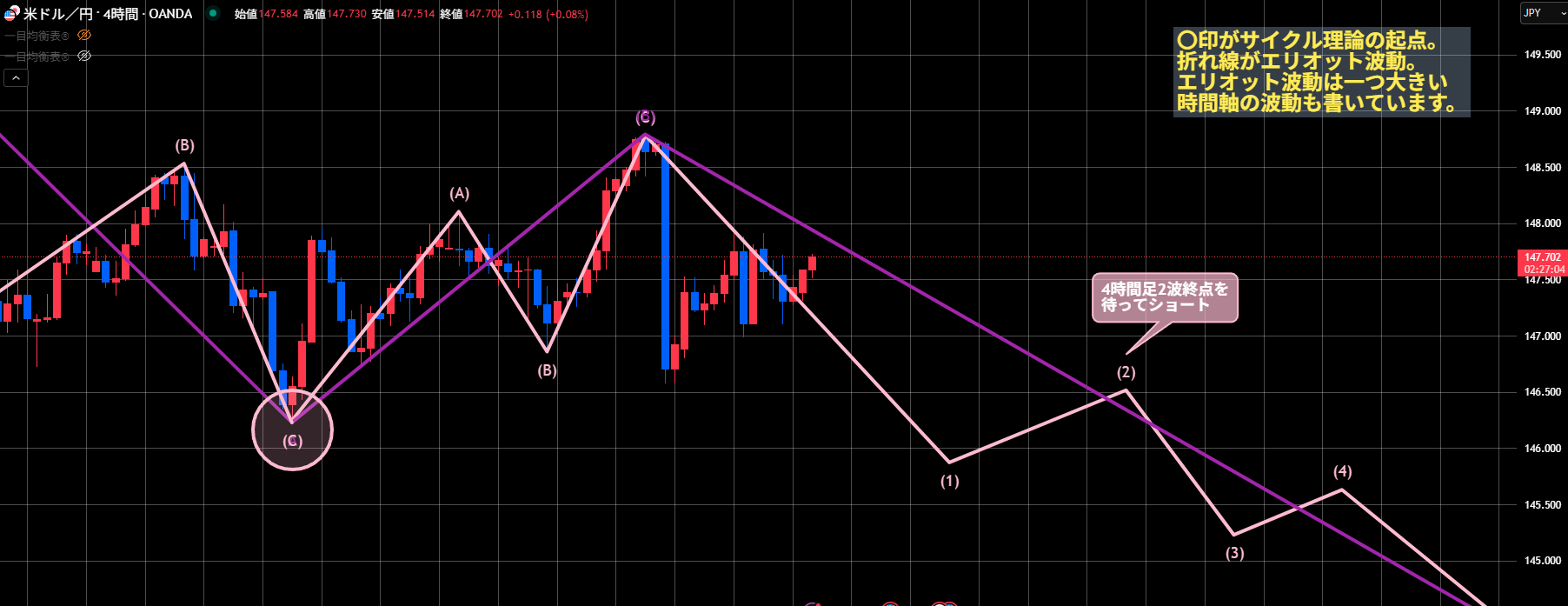 今のところ短期上昇が続いていますが147.94を超えてきたら、少し違うシナリオも想定しておいた方がいいかもしれません。