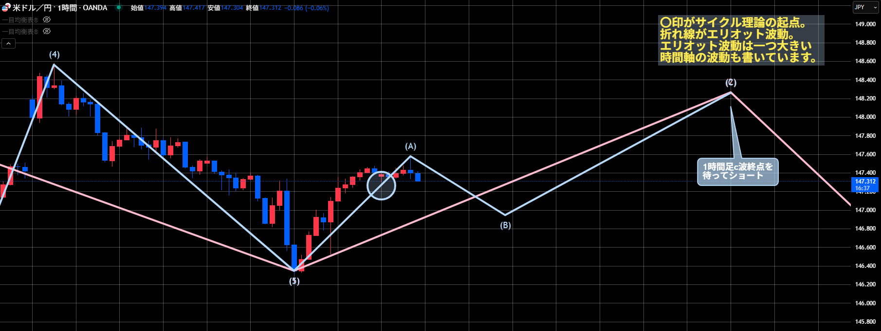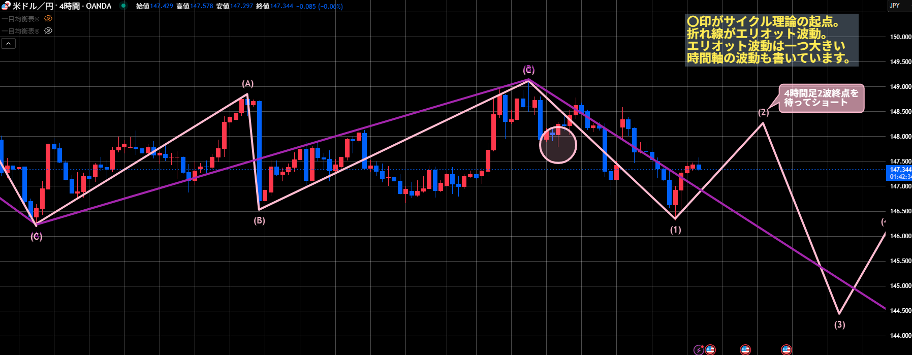 上昇が続いて149.13を超えてきた場合、サイクル理論もエリオット波動も大幅なシナリオ変更が必要になります。