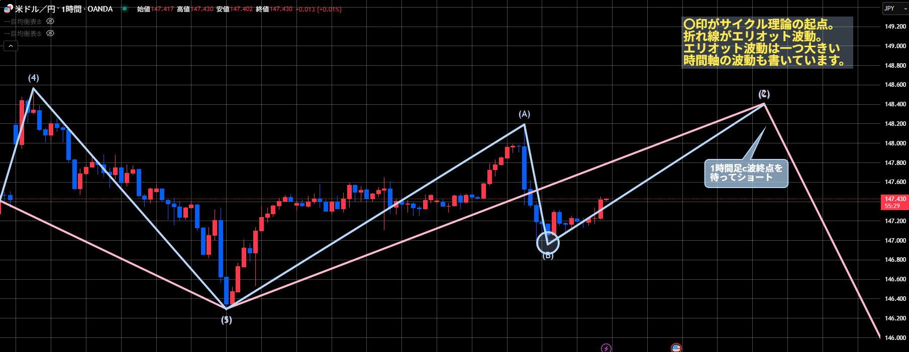 4時間足エリオット波動は2波終点、1時間足エリオット波動はc波終点を待ってショートになります。