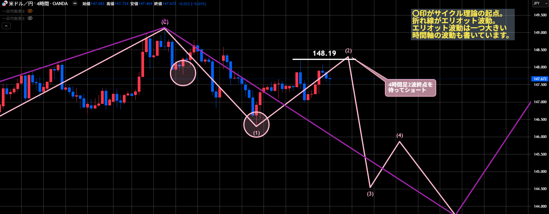 エリオット波動で見ると、4時間足は2波終点待ちの状態ですが、目安は148.19超えで見ています。