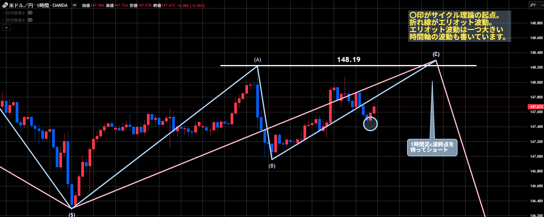4時間足のエリオット波動は2波終点、1時間足のエリオット波動はc波終点を待ってショートになります。