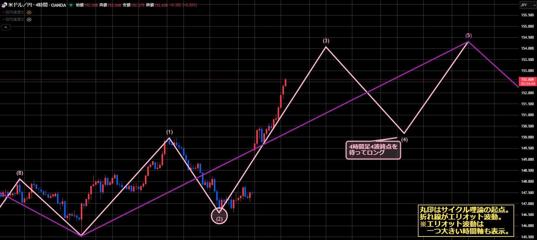 サイクル理論の場合、4Hサイクル天井が4時間のエリオット波動3波終点、4Hサイクルボトムとエリオット波動4波終点とと重なる想定で見ています。