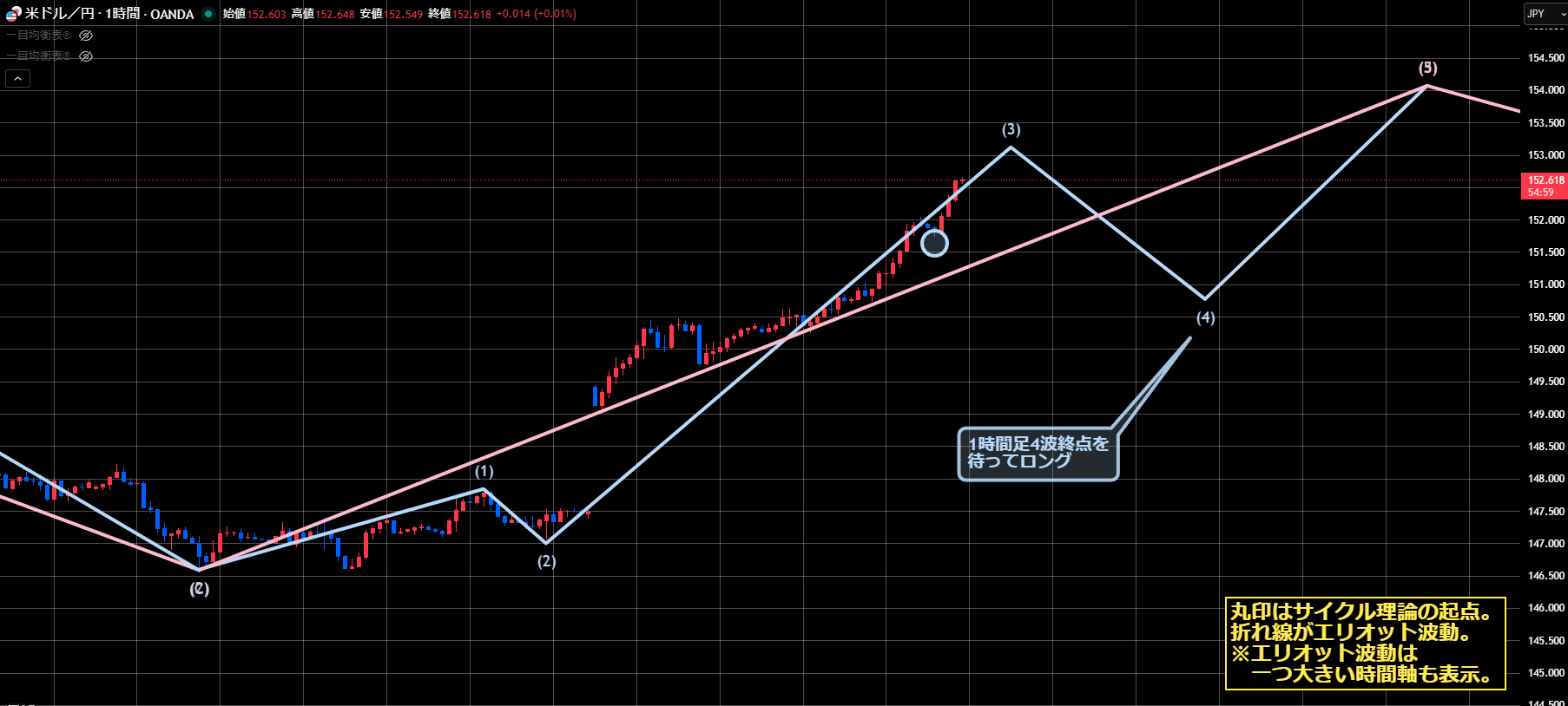 1時間足レベルでも、押し目ができたら押し目買いを狙いたいところですが、1時間足のエリオット波動で狙うのは難易度が高くなります。