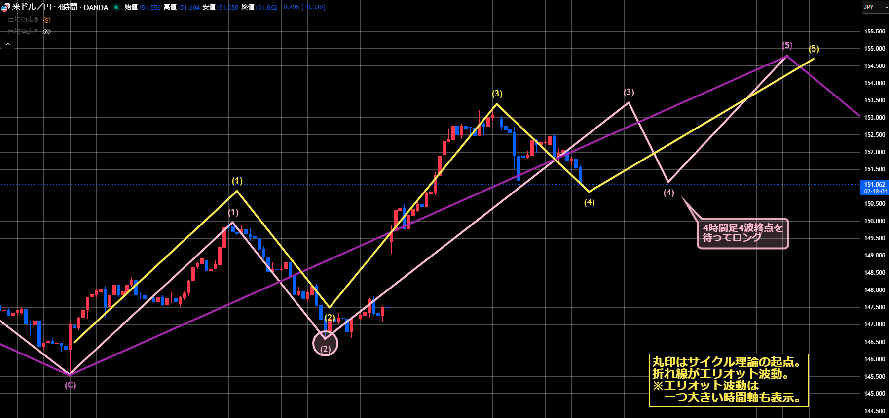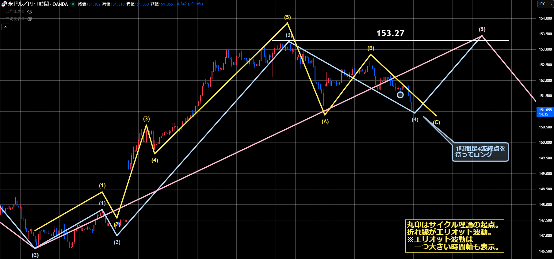 ただ昨日までの想定であれば、1時間足のエリオット波動は5波に入っていましたが、今日の下落で直近安値151.16を割ってきたので、4波継続中になります。