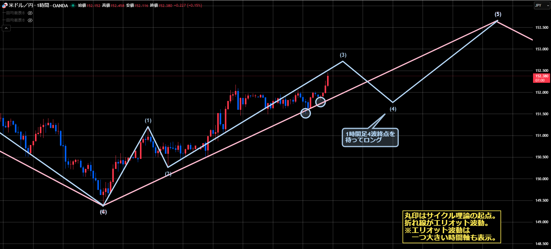 1時間足のエリオット波動ですが、昨日はアップ4波まで進んでいる想定でしたが、直近高値152.17を先ほど超えてきたので、1時間足のエリオット波動は3波が継続中になります。