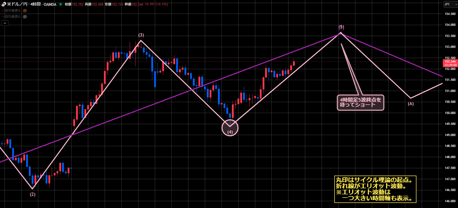 4Hサイクルはサイクル天井からショート、4時間足のエリオット波動は5波終点を待ってショート、4Hサイクル天井と5波終点は重なるポイントとして見ています。