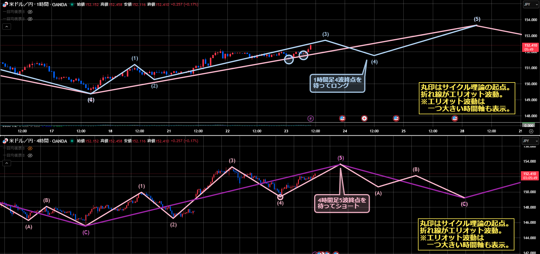 4Hサイクルはサイクル天井からショート、4時間足のエリオット波動は5波終点を待ってショート、4Hサイクル天井と5波終点は重なるポイントとして見ています。
