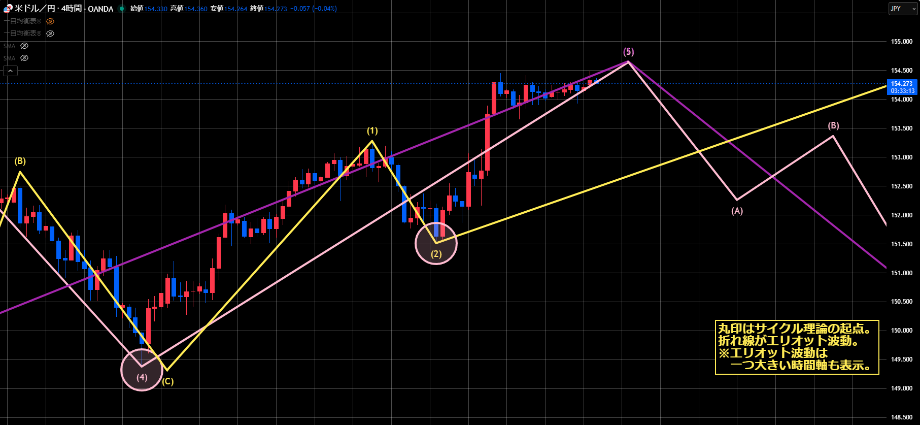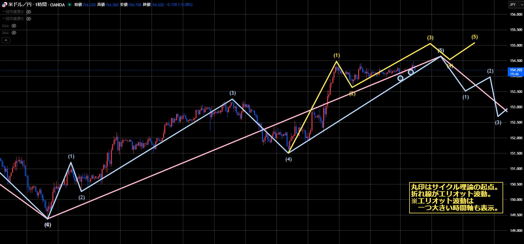 このまま上昇が続くようであれば、前回サイクルが47本目の短縮ボトム151.53が起点のシナリオの可能性が出てきます。