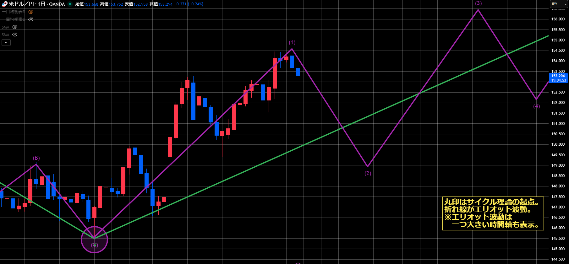 ただし、1時間足の2波終点で154.48を超える戻す上昇があった場合、結果的に5波継続になるので要注意です。