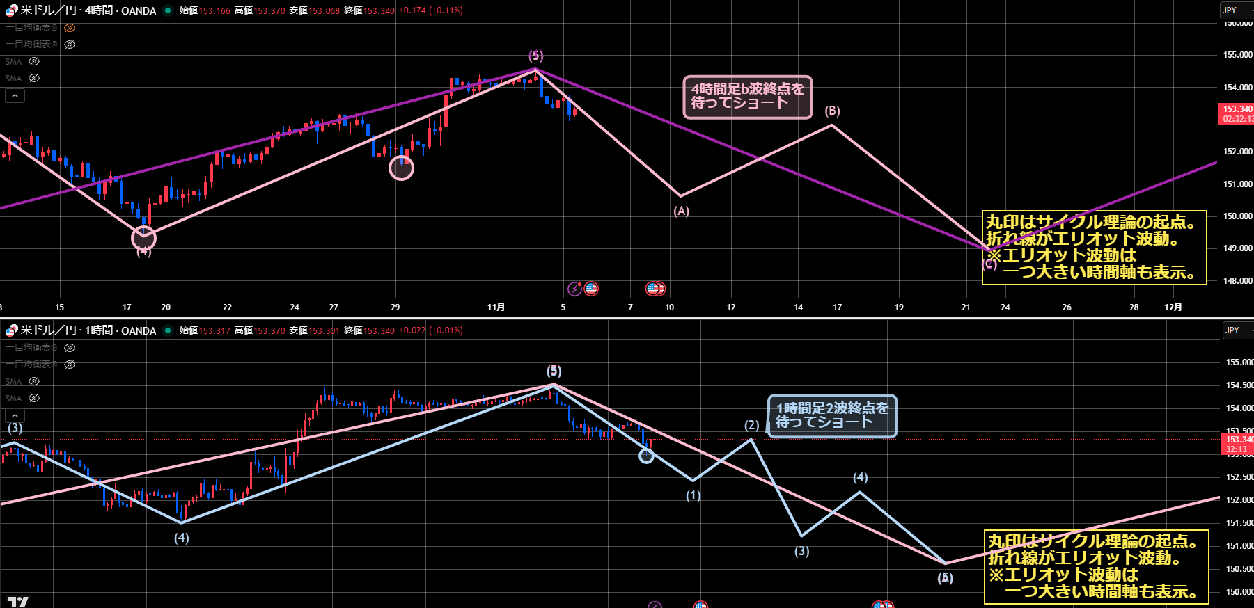 なので、次のエントリータイミングは1時間足のエリオット波動2波終点を待ってショートが直近になります。