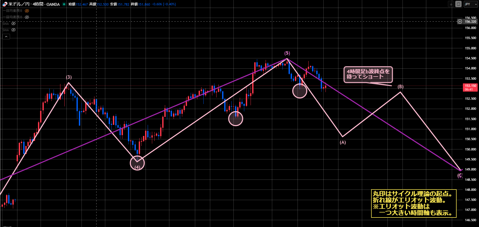エリオット波動は4時間足はb波終点、1時間足は4波終点を待ってショートになります。