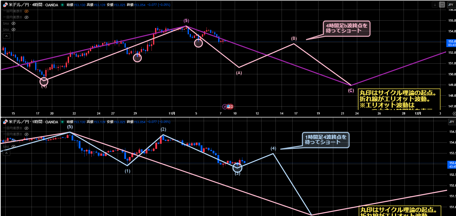 エリオット波動は4時間足はb波終点、1時間足は4波終点を待ってショートになります。