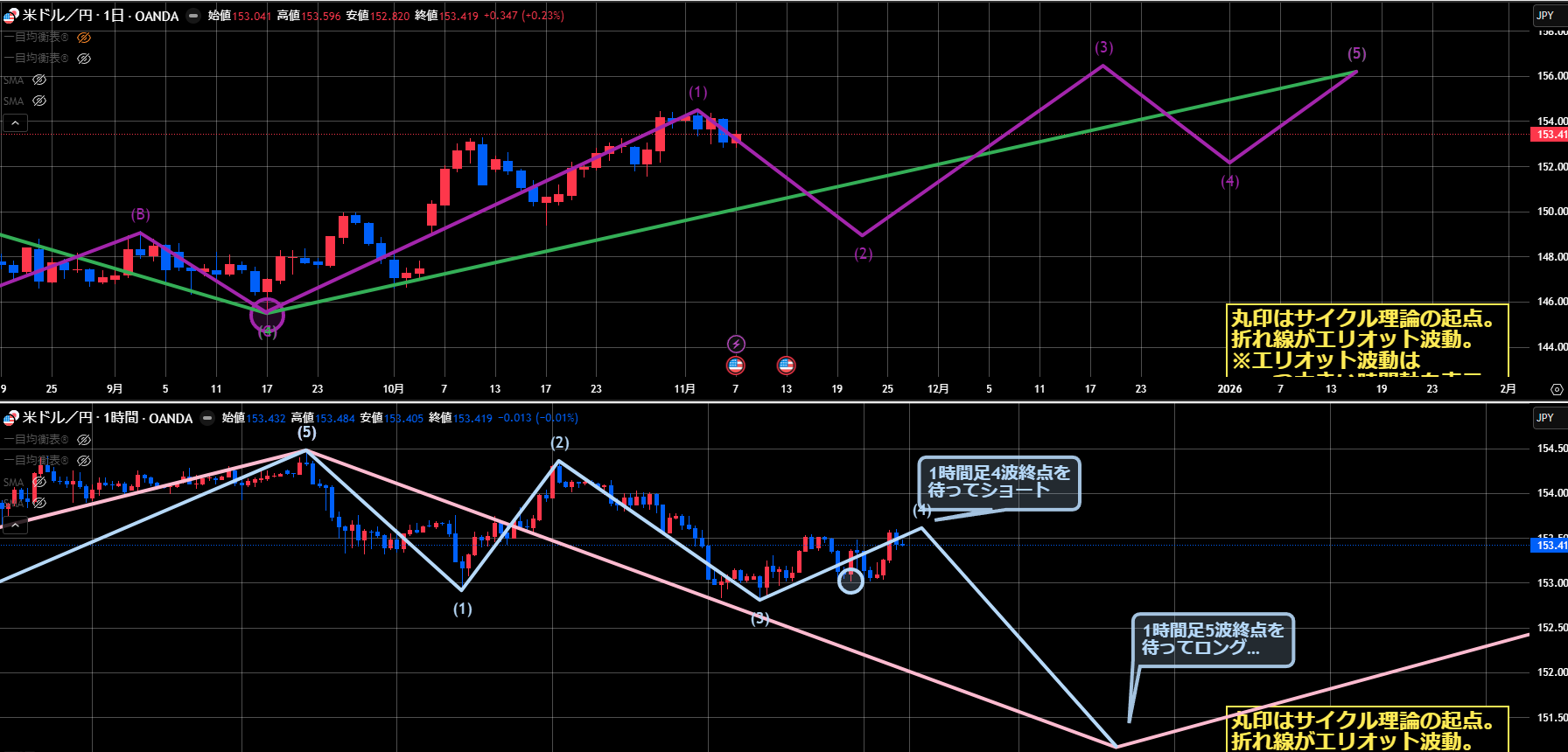 1時間足のエリオット波動に関しては、4波終点を待ってショートですが…